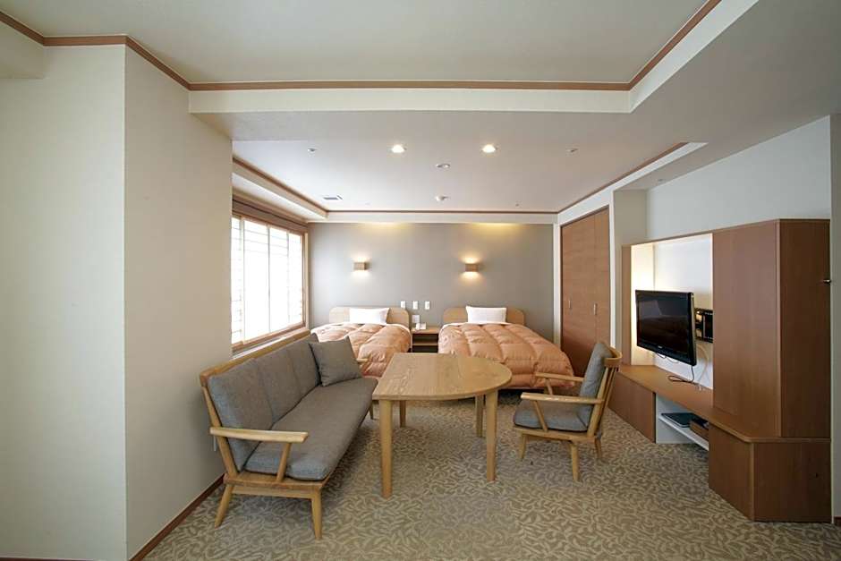 Spacious room featuring a tatami (woven mat) floor, a flat-screen TV and a kitchenette. Japanese futons are spread for sleeping, and it's fitted with an private bathroom. Yukata robes and free green tea are provided.